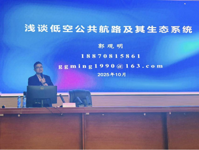 讲座中,郭观明博士围绕低空公共航路的核心概念、发展现状展开解读。他结合行业案例,系统分析了低空航路规划的技术要点、安全规范及政策导向,深入阐释了低空交通生态系统的构成要素与协同发展逻辑。讲解过程中,郭博士还与现场师生积极互动,针对大家提出的低空经济应用场景、技术瓶颈等问题进行细致解答,现场学术氛围浓厚。