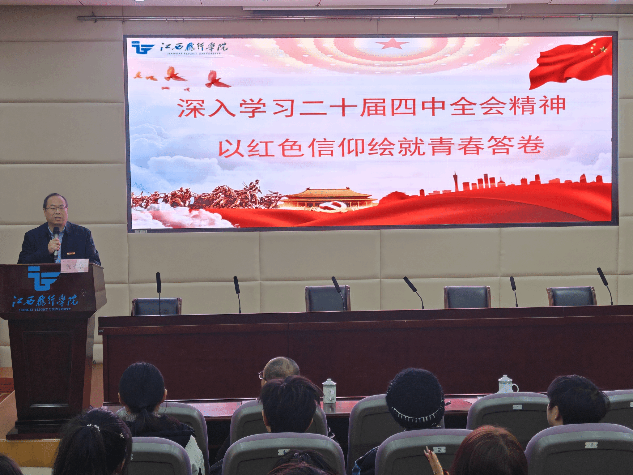 为深入学习贯彻党的二十届四中全会精神,推动红色基因融入青年成长血脉,12月31日,江西飞行学院首批“红色班级”赣物远航班在一教学术报告厅成功举办“深入学习党的二十届四中全会精神,以红色信仰绘就青春答卷”主题班会。校党委委员、副校长郭军华出席并讲话。