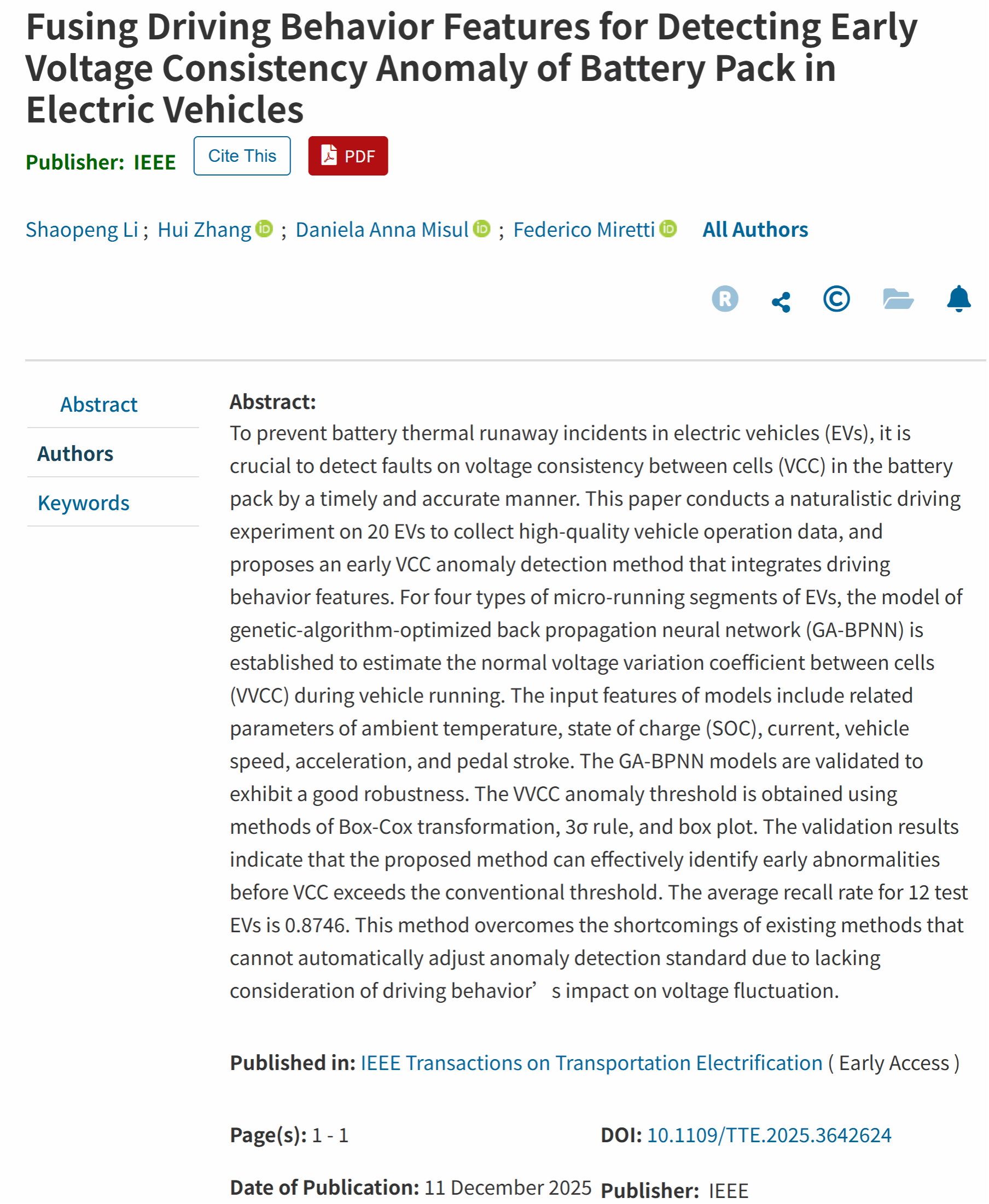 近日,我院教师李少鹏以江西飞行学院为第一署名单位在电动交通领域顶级期刊《IEEE Transactions on Transportation Electrification》上发表题为“Fusing Driving Behavior Features for Detecting Early Voltage Consistency Anomaly of Battery Pack in Electric Vehicles”的文章,李少鹏为论文第一作者,武汉理工大学智能交通系统研究中心张晖研究员、都灵理工大学汽车研究与可持续交通中心Daniela Anna Misul教授为论文共同通讯作者。