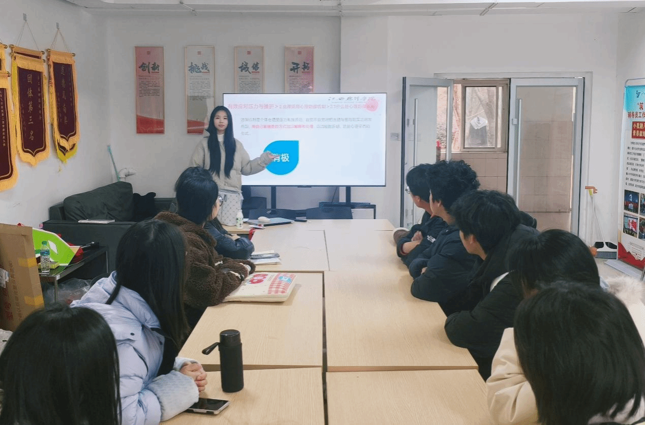 学院心理宣传部部长陈萍围绕压力含义、应对方法展开讲解,各班心理委员及选派寝室长参会聆听。