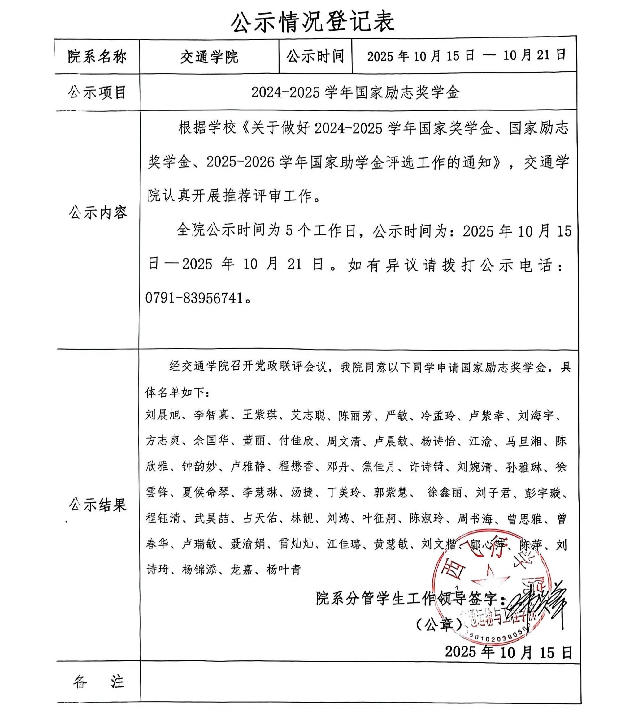 2024-2025学年交通运输与工程学院国家励志奖学金名单公示