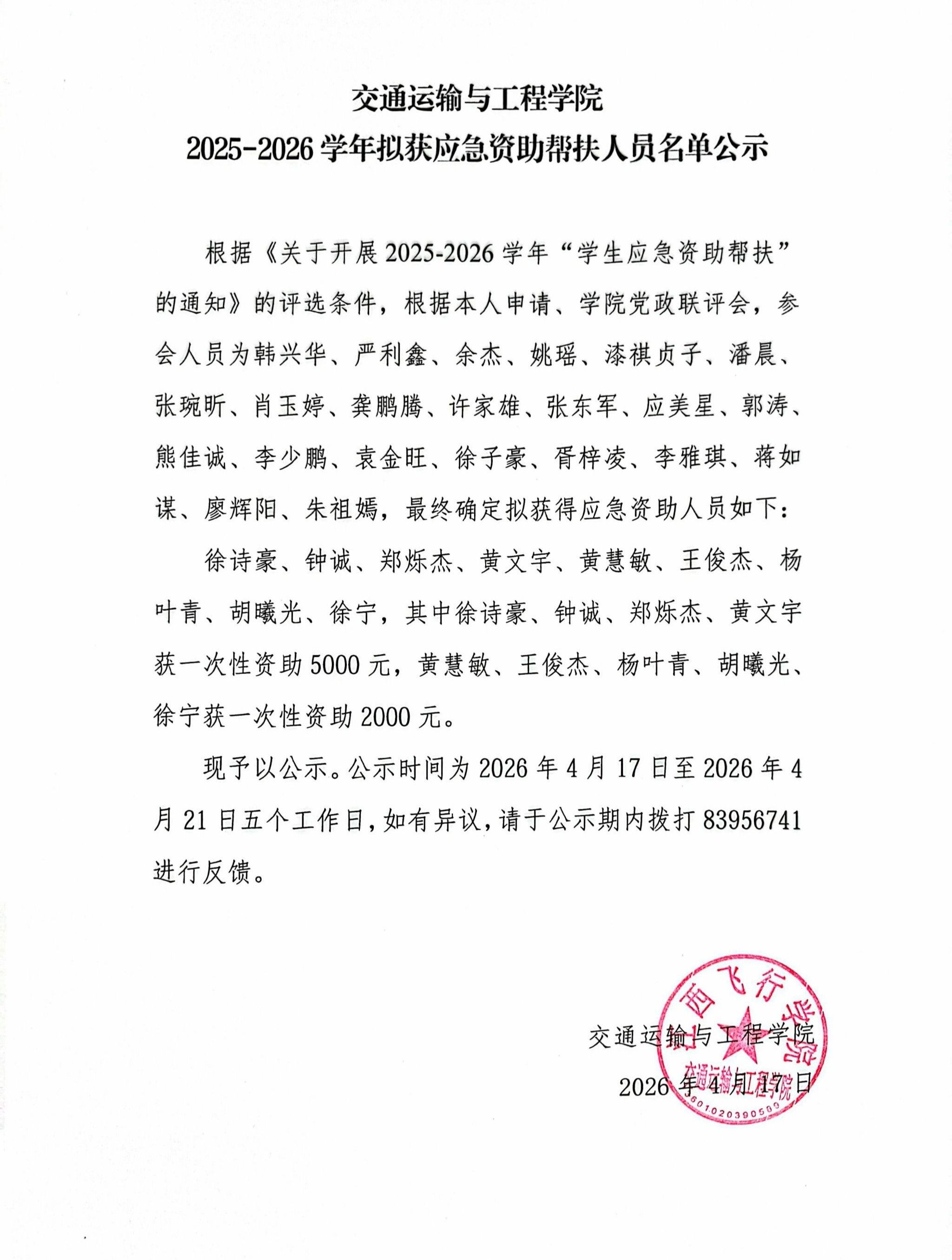 交通运输与工程学院2025-2026学年拟获应急资助帮扶人员名单公示