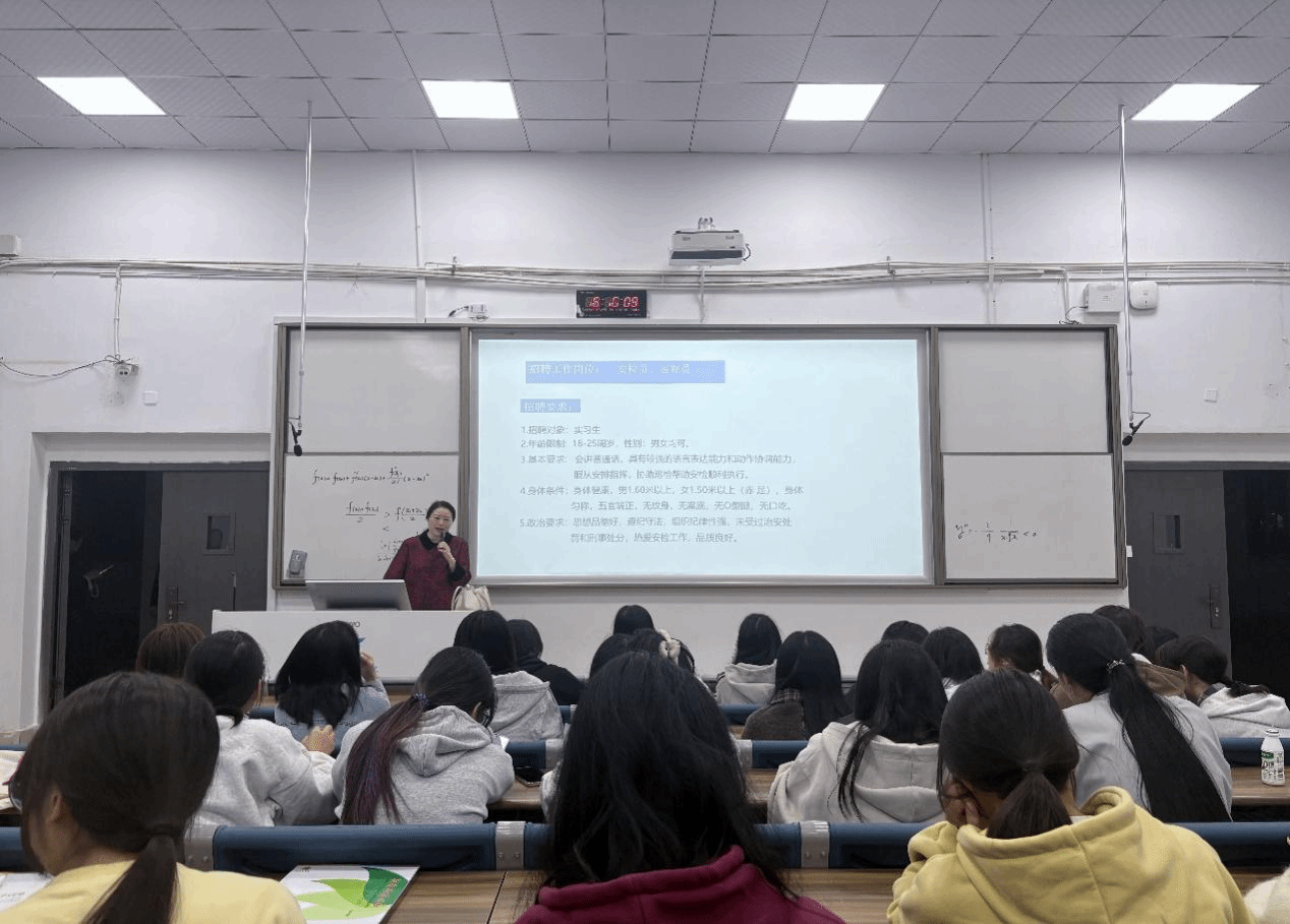 招聘会上,企业宣讲人介绍了“安检员、巡线员”实习岗位,明确了年龄、沟通能力、身体条件、政治素养等招聘要求,现场学生认真关注岗位细节。